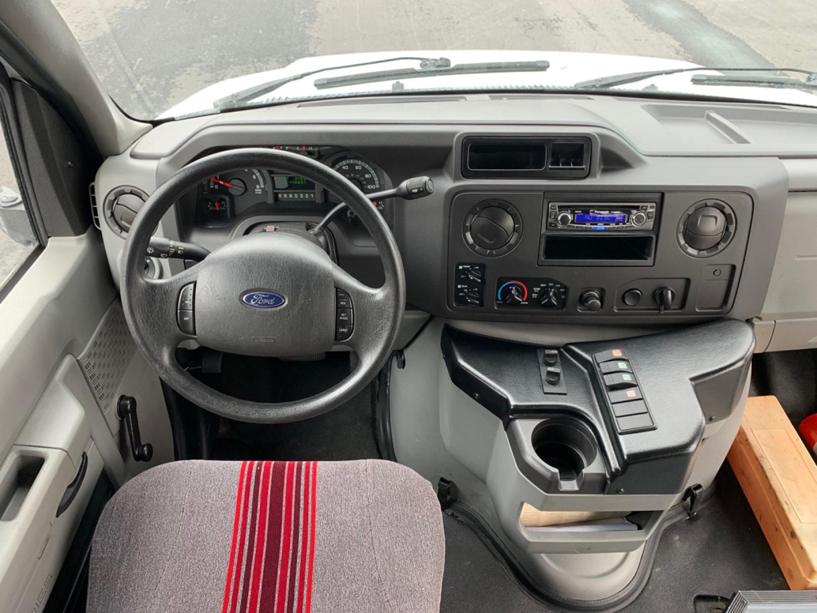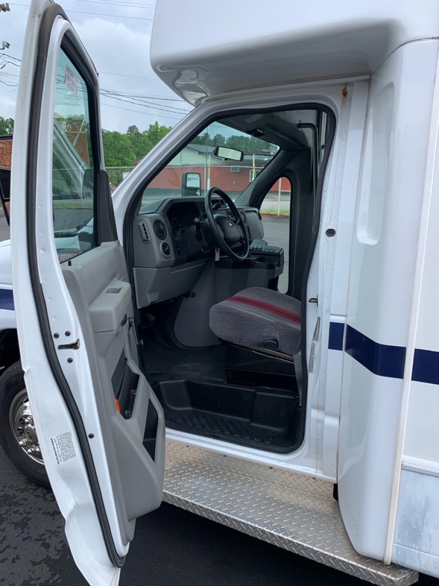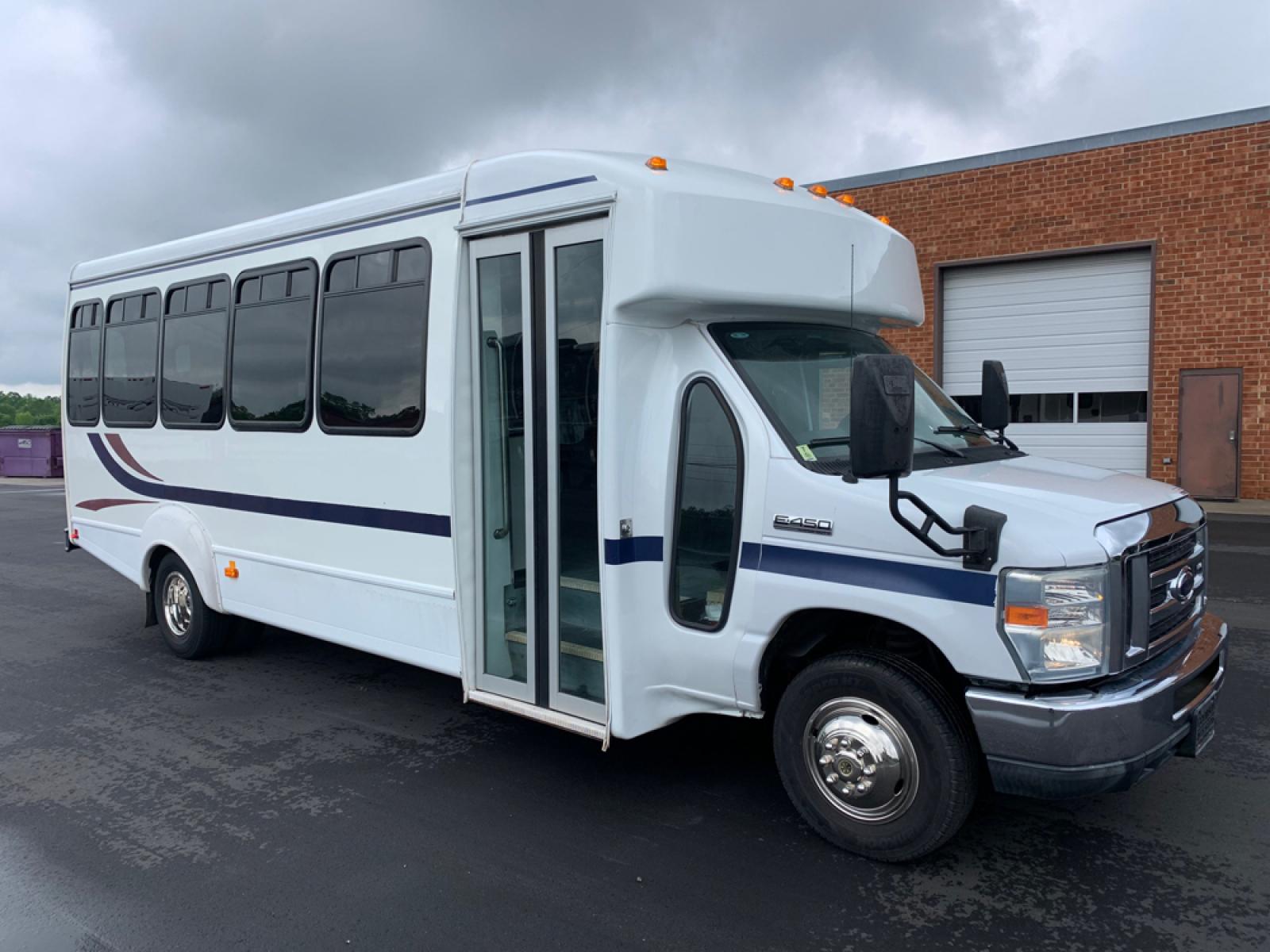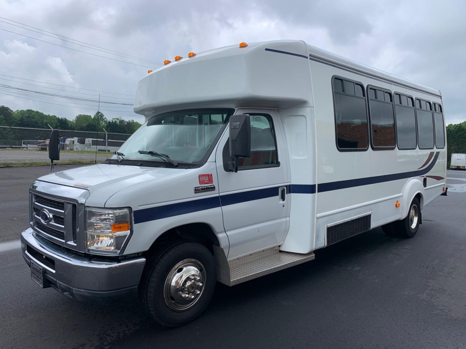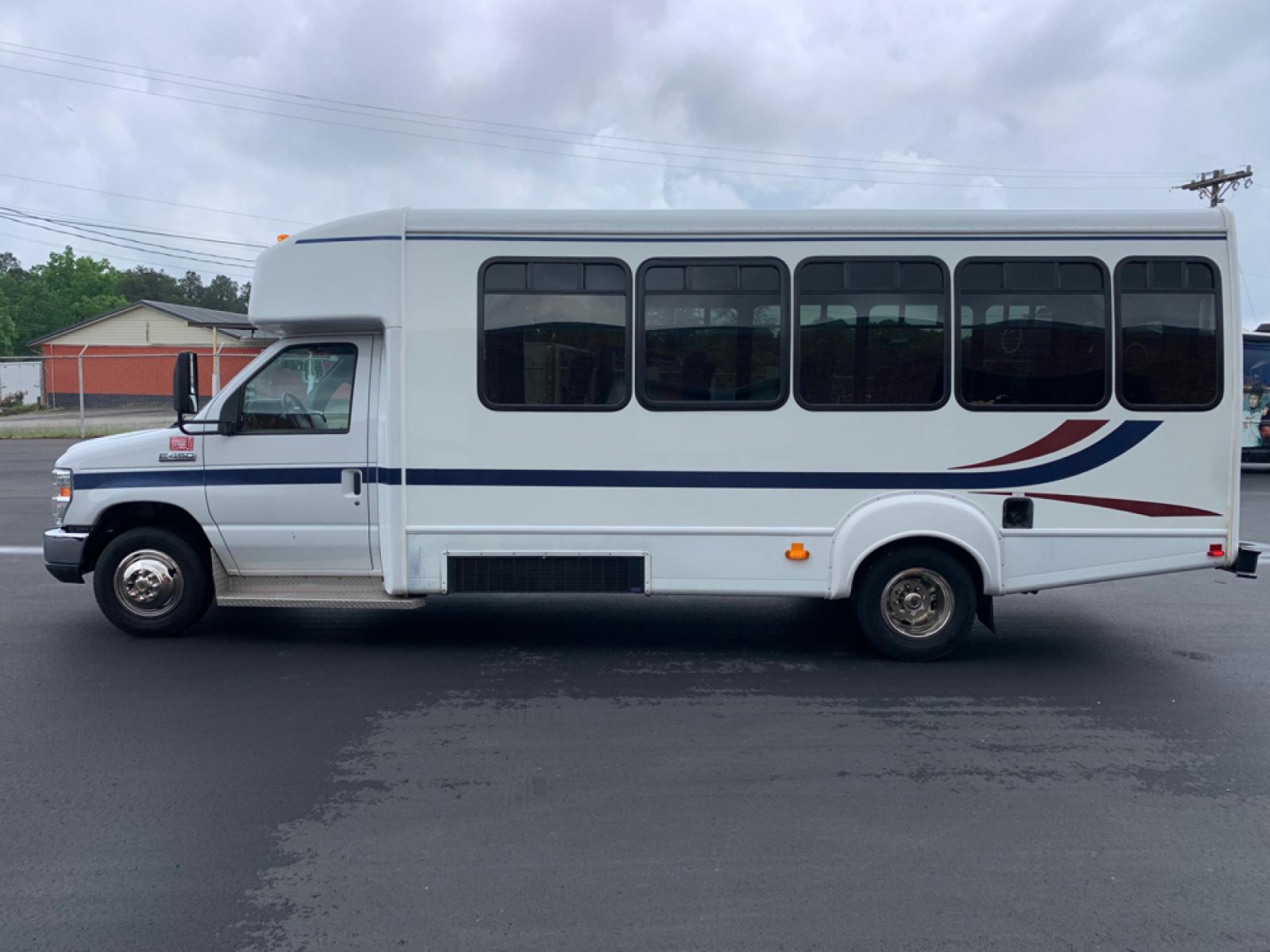 2010 Ford E-450 – Goshen Coach - 25 Passengers + Driver - 6.8L V10 Engine – Automatic - High Back Reclining Seats – Seat Belts -Electric Entrance Doors – Overhead Storage – Reading Lights – Front/Rear AC – Stainless Wheel Simulators