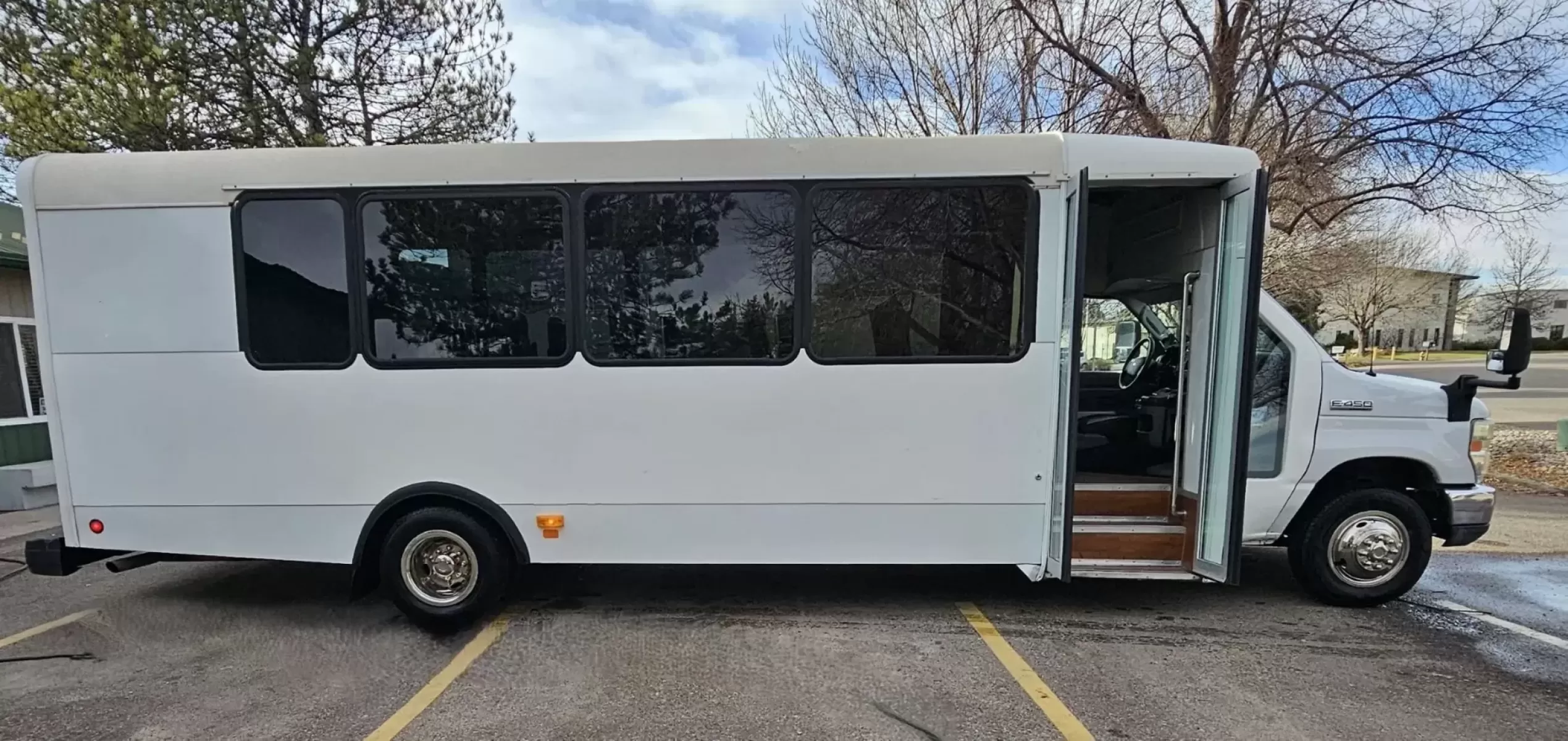 2015 FORD E450 CHAMPION - CHALLENGER V-10 GAS 24 PASSENGER PLUS DRIVER WHITE EXTERIOR EXECUTIVE SHUTTLE BLACK EXECUTIVE SEATS AISLE ARMREST LAP BELTS RECLINER SEATS WOOD LOOK FLOORING REAR LUGGAGE AND MUCH MORE! - WELL MAINTAINED FINANCING AVAILABLE LOCATED IN FT COLLINS